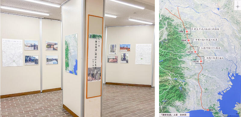 | (2)衛星写真に鎌倉街道の推定路線と今回御紹介している4か所の位置を入れたパネルもあります。 |